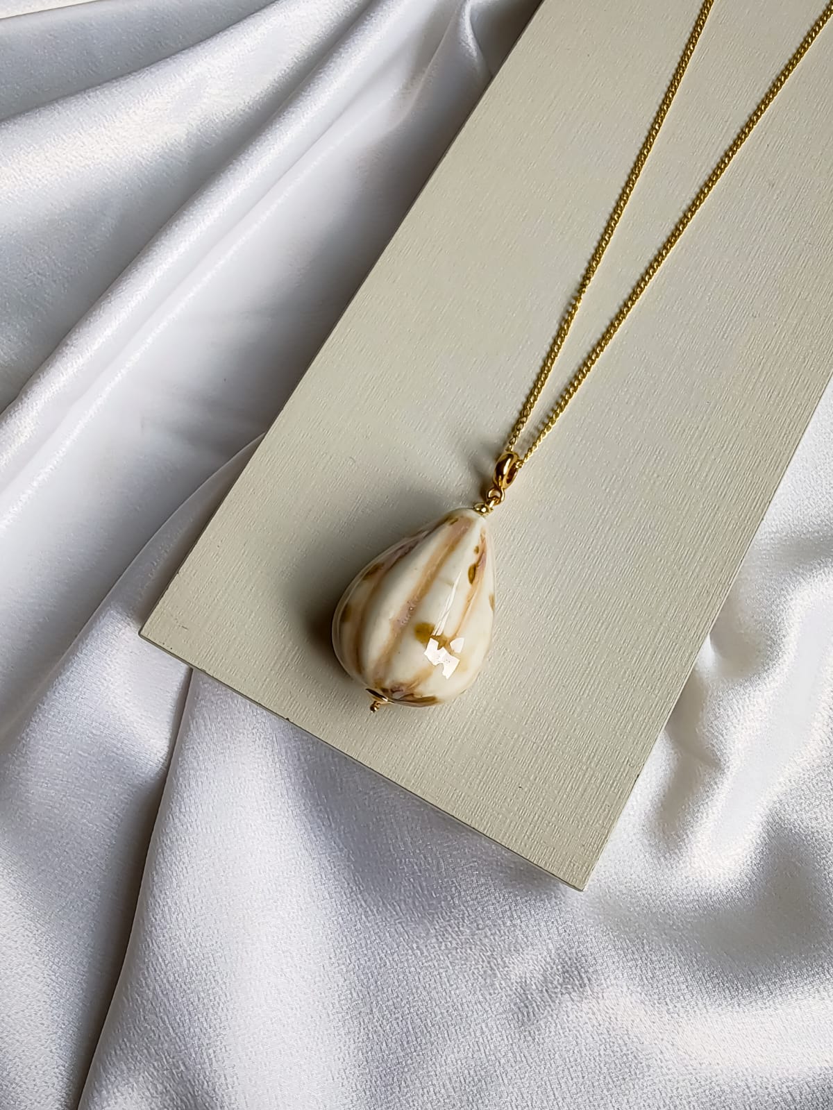 Com corrente dourada e pingente em formato de gota, este colar longo traz o contraste marcante do bege com nuances em marrom, criando uma peça sofisticada e versátil. Para as amantes do menos é mais, esse é o minimalismo que não passa despercebido.