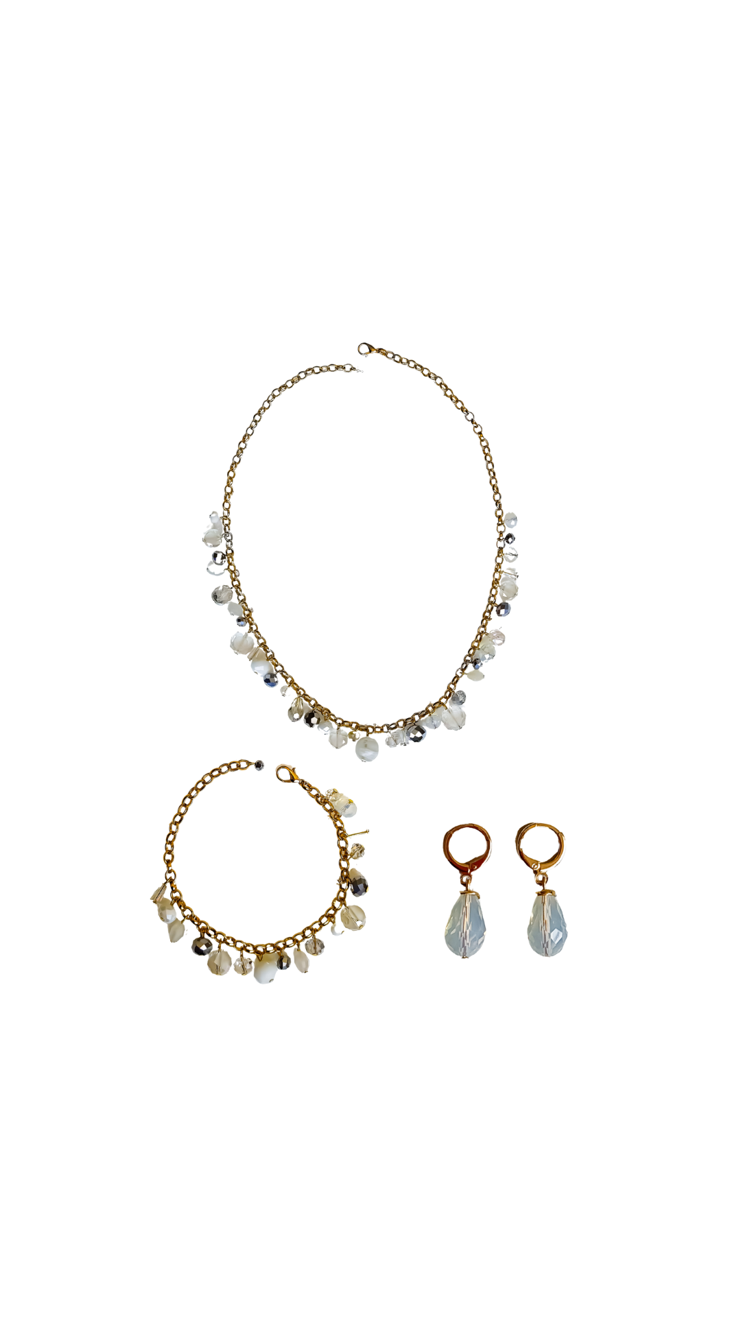 O Conjunto Essência – Branco foi criado para quem aprecia elegância leve, brilho sutil e um design que atravessa ocasiões com naturalidade. Composto por colar, pulseira e brincos, ele combina o dourado sofisticado com pedrarias brancas e transparentes, criando um visual delicado, luminoso e extremamente versátil.