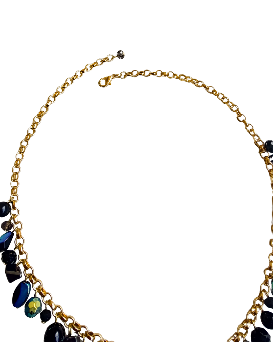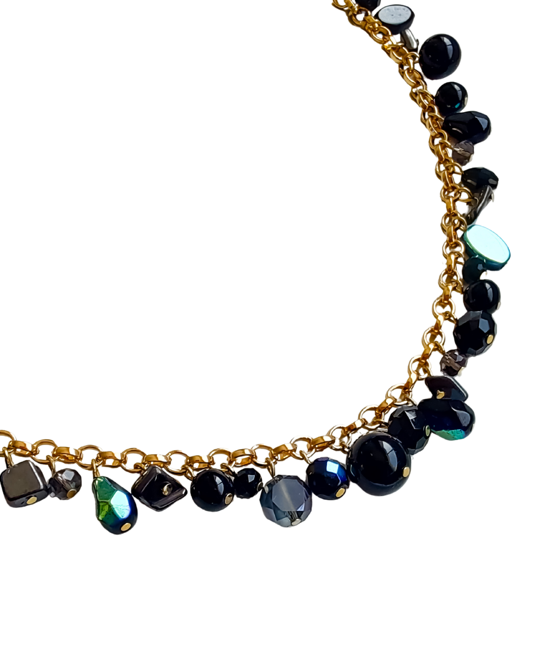 O colar e a pulseira são confeccionados com pedrarias múltiplas, aplicadas manualmente, o que faz com que nenhuma peça seja exatamente igual à outra. Cada conjunto possui pequenas variações naturais, tornando cada criação exclusiva e única.