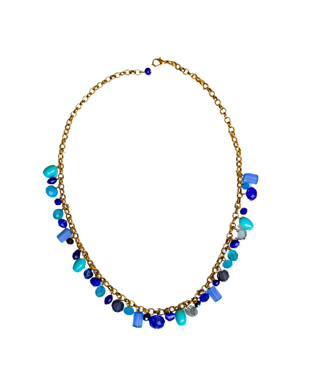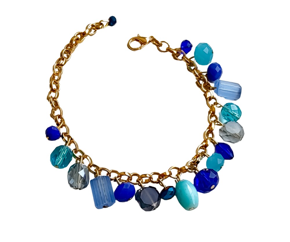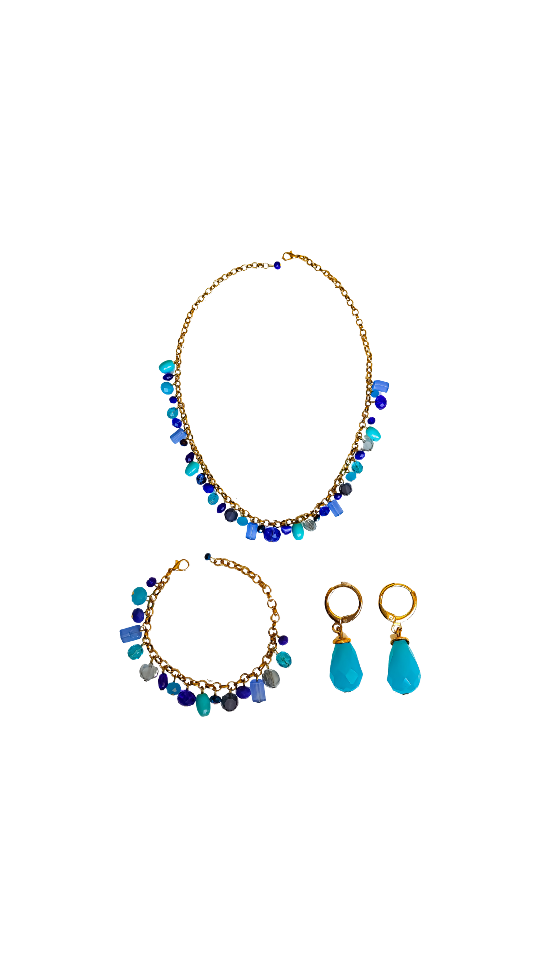 O Conjunto Essência – Azul traduz frescor, sofisticação e leveza em uma composição equilibrada e marcante. Formado por colar, pulseira e brincos, ele combina o dourado com pedrarias em diferentes tons de azul — do azul profundo ao azul mais claro — criando contraste, movimento e profundidade visual.